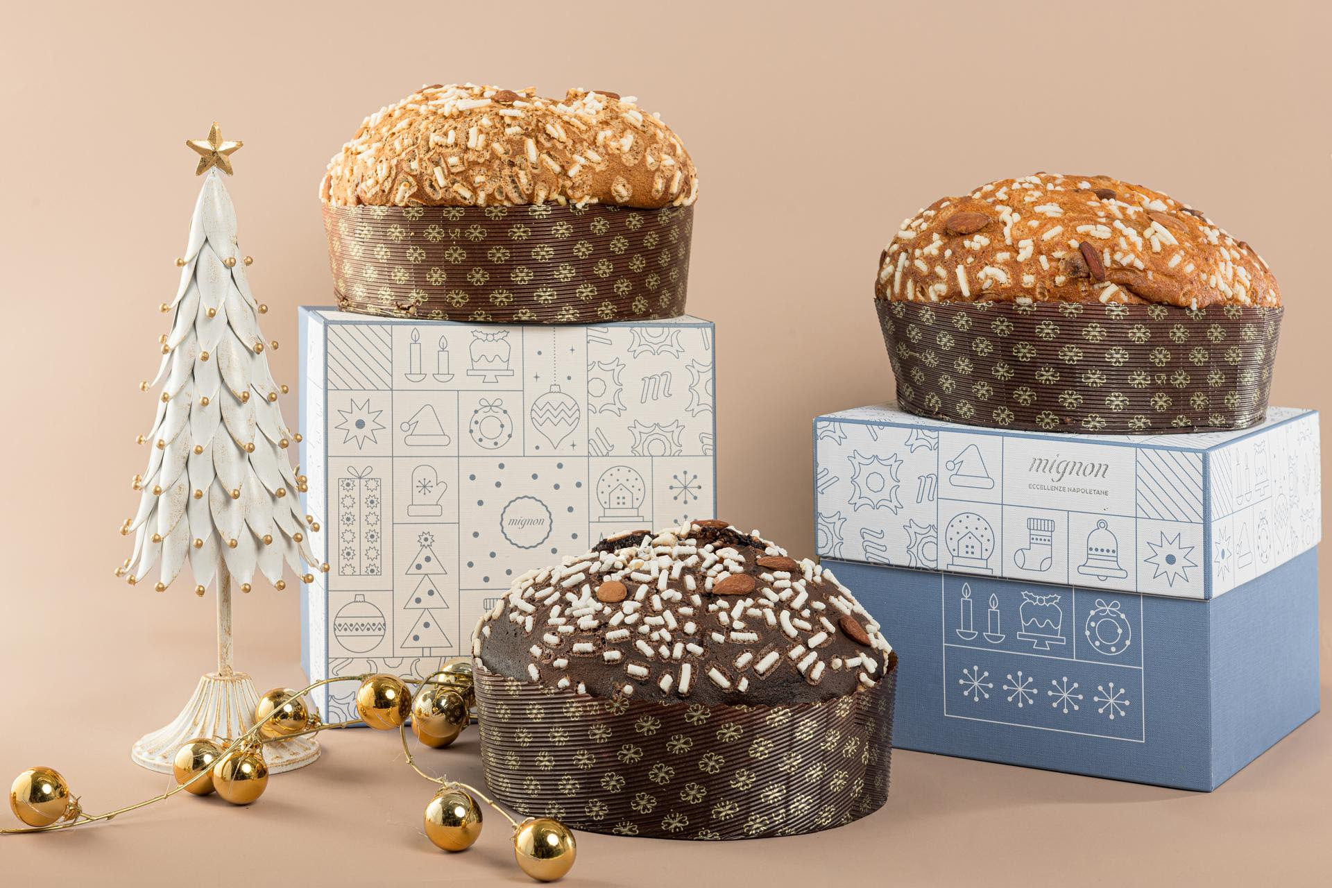 Protagonista assoluto è il panettone artigianale, interpretato secondo la sensibilità napoletana e preparato nei laboratori Mignon con lievito madre vivo custodito nel laboratorio di famiglia da oltre 60 anni. Lievitazione naturale di oltre 36 ore, ingredienti selezionati e copertura con glassa alle mandorle, mandorle intere e granella di zucchero rendono ogni creazione soffice e profumata.