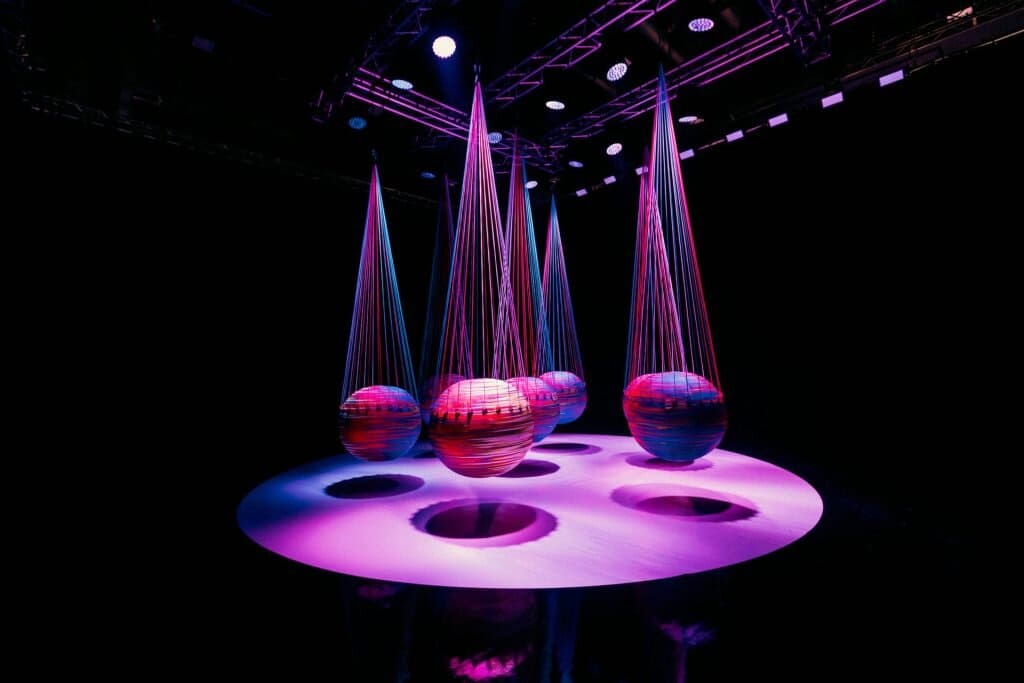 L’allestimento richiama l’elemento che dà nome alla mostra: l’aria. Le opere sfruttano la leggerezza e il movimento dell’aria per dare vita a forme scultoree che cambiano mentre il visitatore si muove al loro interno. È un modo nuovo di vivere l’arte contemporanea, che privilegia l’esperienza diretta e sensoriale.